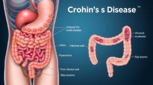 Crohn’s Disease is a chronic, inflammatory bowel disease (IBD) that can affect any part of the gastrointestinal (GI) tract from the mouth to the anus, but most commonly involves the small intestine (ileum) and the colon. It is characterized by inflammation that extends through all layers of the bowel wall (transmural inflammation) and often appears in patches or skip lesions, with healthy tissue interspersed between inflamed areas. Unlike ulcerative colitis, which primarily affects the large intestine and only the innermost lining, Crohn’s can lead to strictures, fistulas, and abscesses due to its deep, patchy inflammation.
