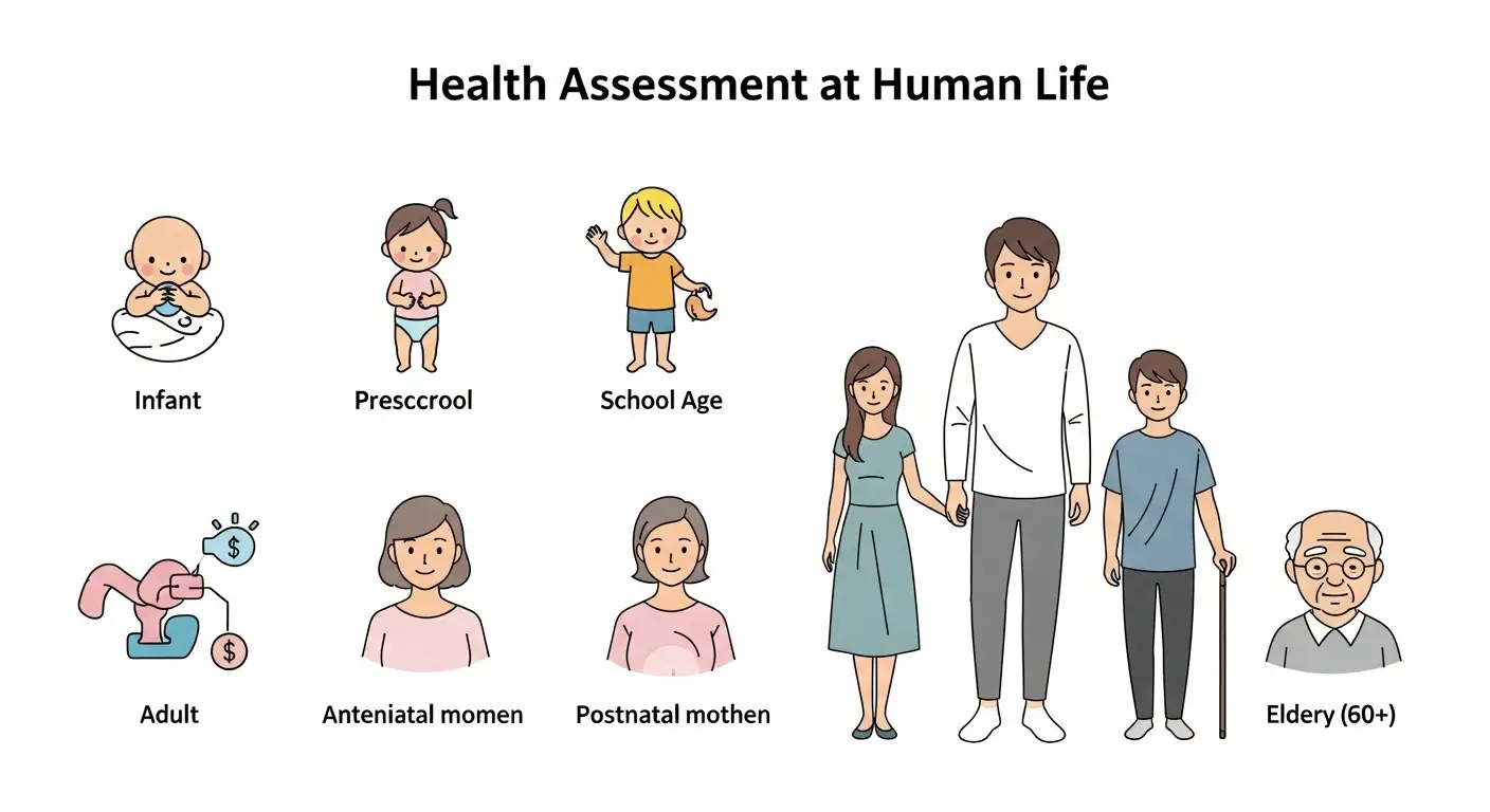 Each age group requires a tailored health assessment, based on their growth stage and risk factors.