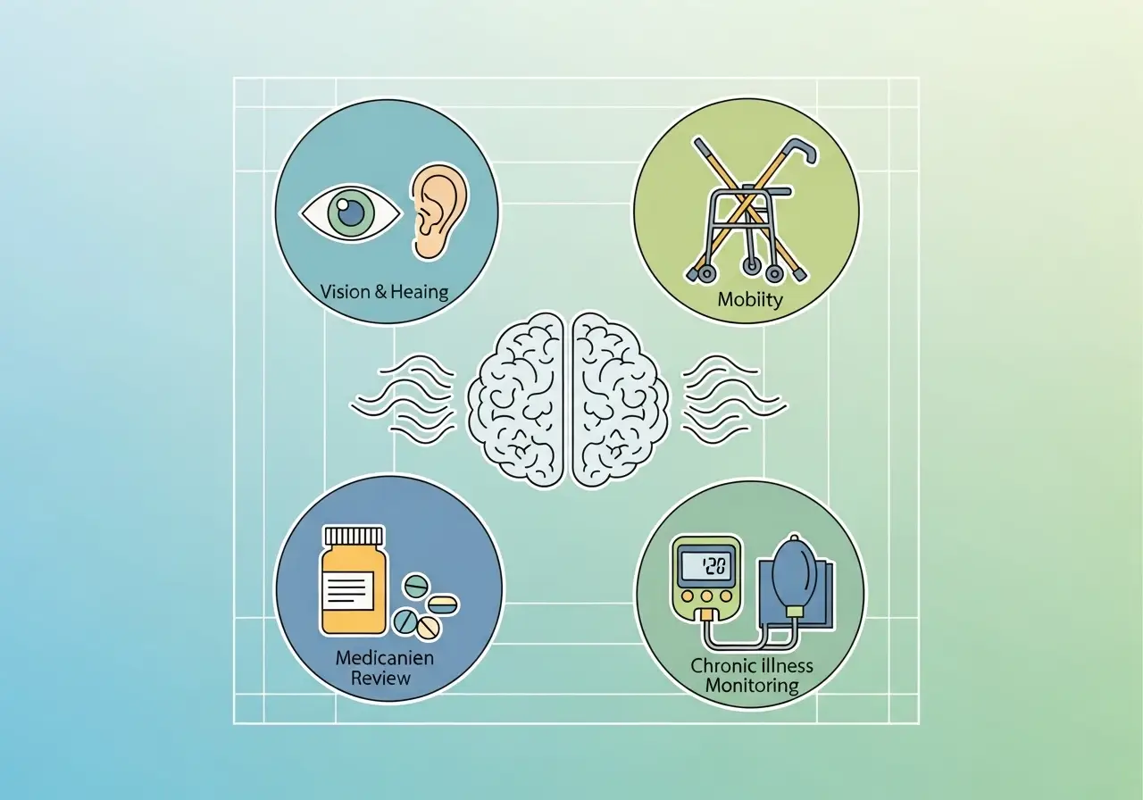 • Vision: Regular eye examinations help detect cataracts, glaucoma, and macular degenerationβ€”all common in aging.